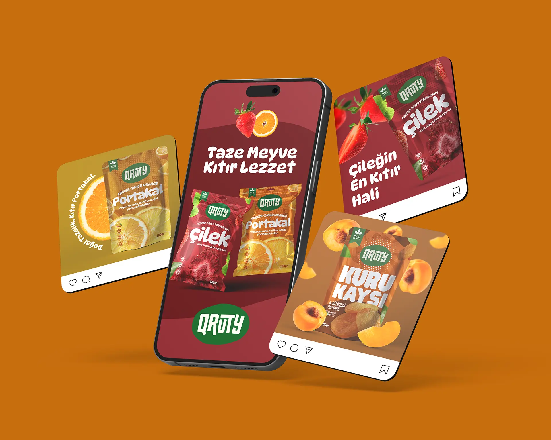 Qruty logosu, markanın doğal kökenini ve sade üretim yaklaşımını yansıtan organik bir form üzerine inşa edildi. Keskin geometri yerine kullanılan “doğal meyve lekesi” formu, kurutulmuş meyvelerin özünü—gerçek meyveden gelen saf içerik—ilk temas anında hissettiriyor.